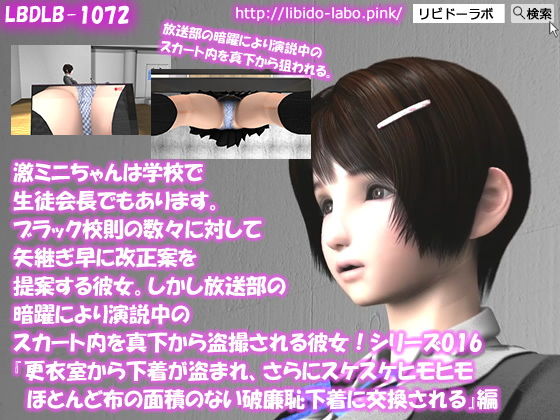 【▲50△50】激ミニちゃんは学校で生徒会長でもあります。ブラック校則の数々に対して矢継ぎ早に改正案を提案する彼女。しかし放送部の暗躍により演説中のスカート内を真下から盗撮される彼女!シリーズ016『更衣室から下着が盗まれ、さらにスケスケヒモヒモほとんど布の面積のない破廉恥下着に交換される』